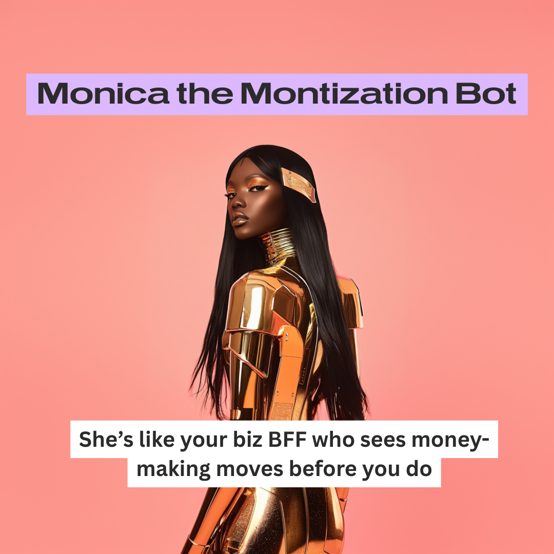 Monica is your AI monetization strategist. Answer a few quick questions about your business, and she'll tell you exactly which AI income path fits—then hand you revenue-ready ideas you can actually launch. Lead magnets, VIP services, passive products—whatever turns your expertise into money without the guesswork.